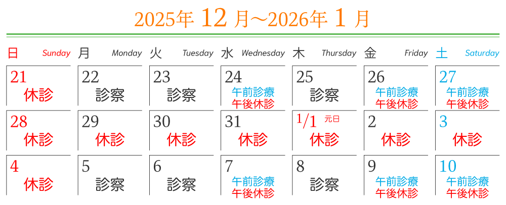 HOME お知らせ 年末年始休診のお知らせ 年末年始休診のお知らせ 2025年12月28日(日)から2026年1月4日(日)まで年末年始の休診とさせていただきます。1月5日(月)から通常診療いたします。ご不便をおかけいたしますが、よろしくお願いいたします。